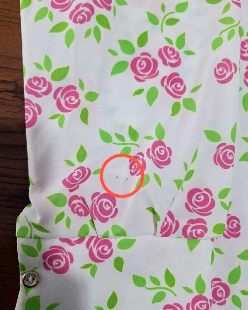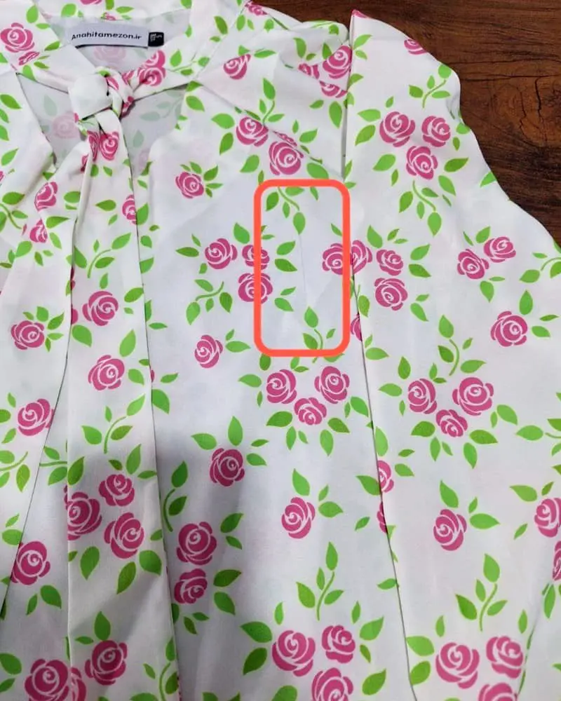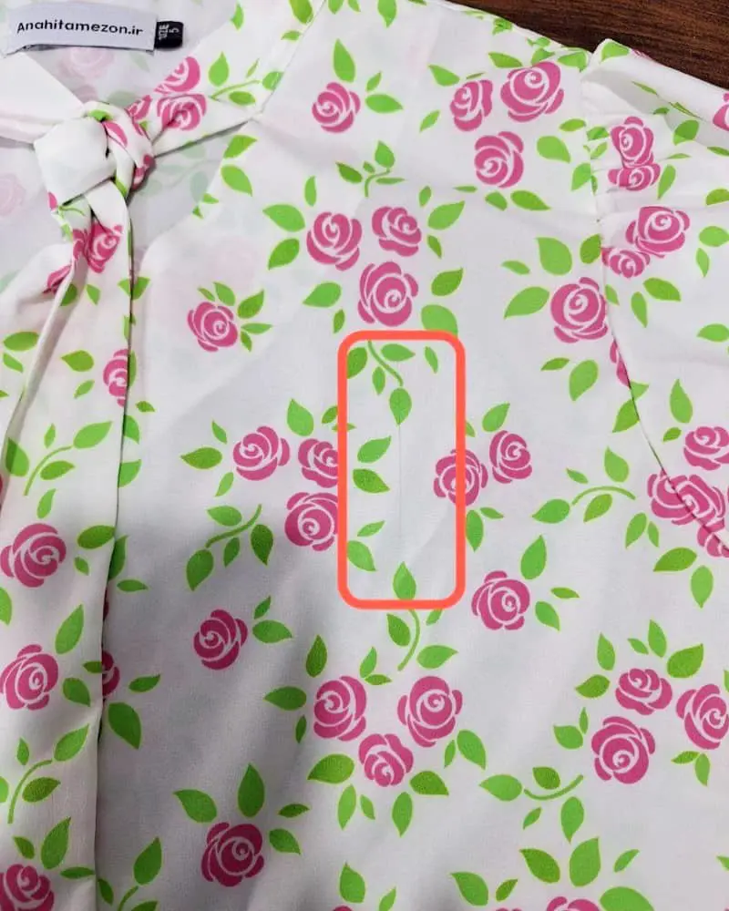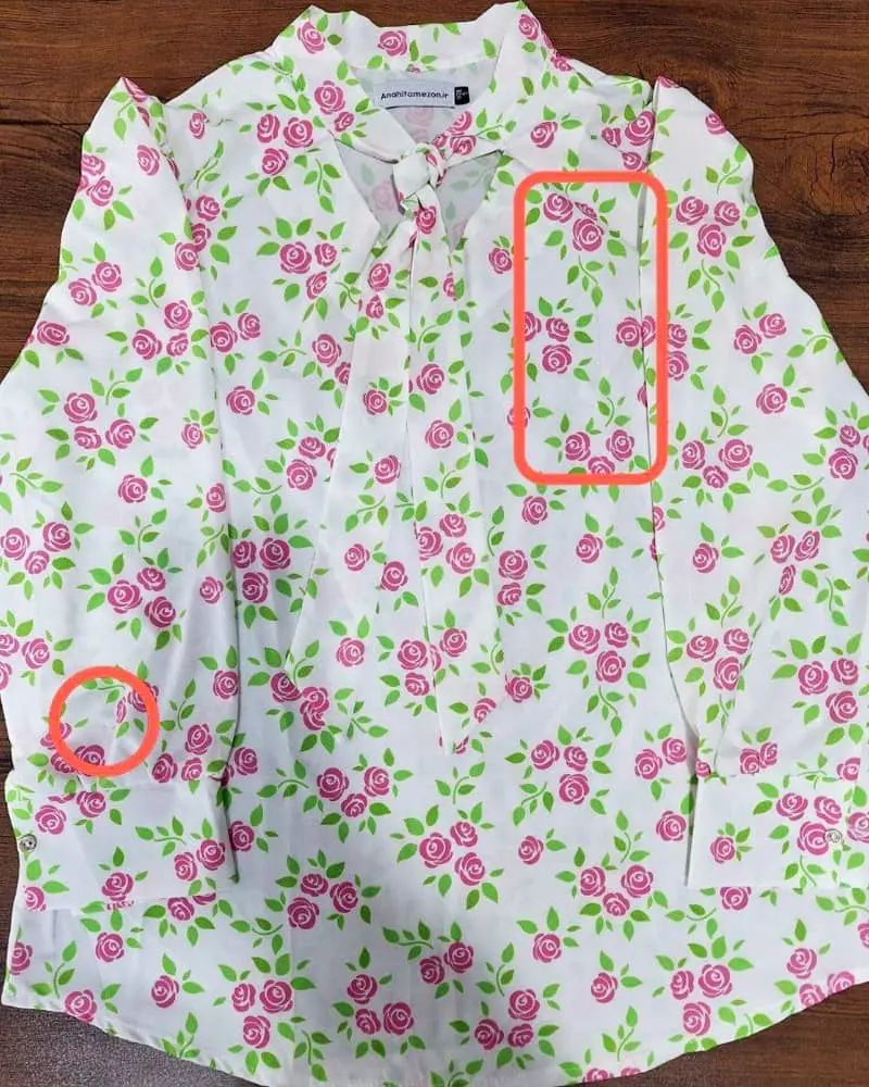 نکته : در قسمت جلو شومیز مشکل چاپی به صورت یک خط وجود دارد و در قسمت آستین هم دو نقطه ریز کوچک چاپی نیز وجود دارد
